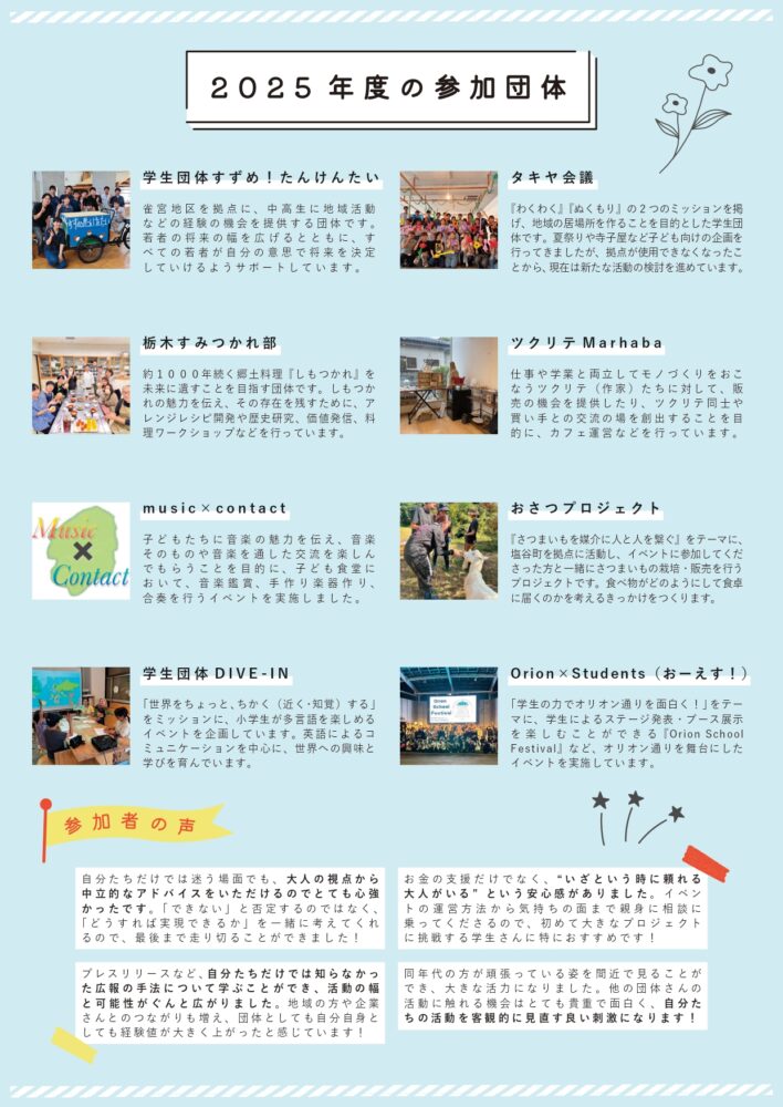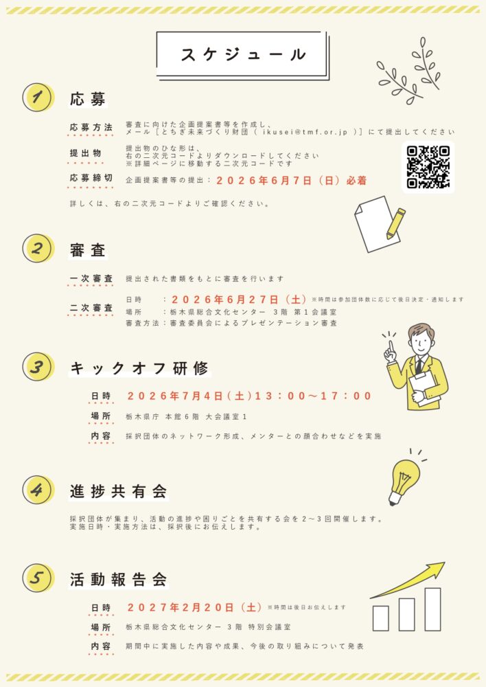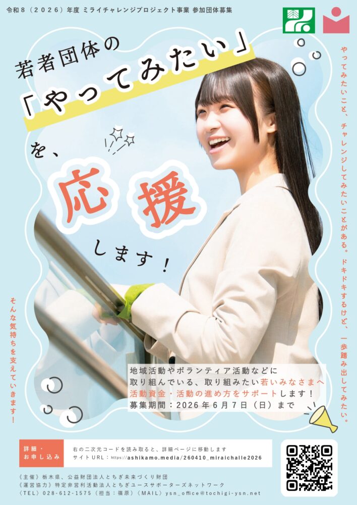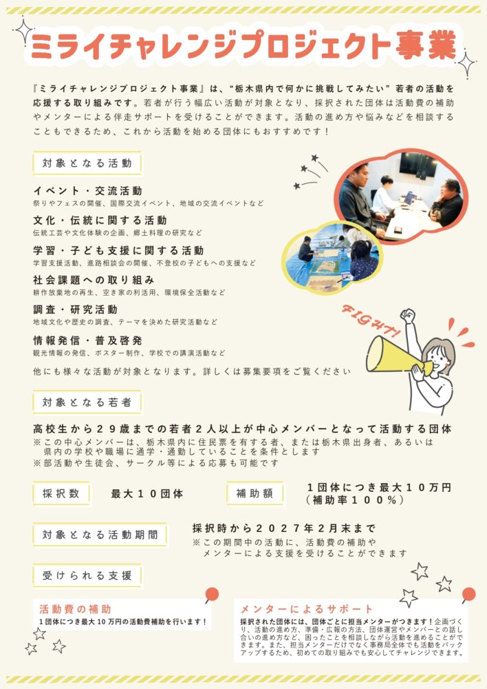 栃木県(県知事:福田富一)および公益財団法人とちぎ未来づくり財団(理事長:千金楽宏)は、栃木県内で活動を行う若者団体の取り組みをサポートするため、ミライチャレンジプロジェクト事業を行います。本事業では、最大10万円の活動費補助や、活動を伴走支援する「メンター」および、活動へのアドバイスを行う「アドバイザー」によるサポートにより、若者団体の活動をサポートします。本事業はNPO法人とちぎユースサポーターズネットワーク(代表理事:岩井俊宗)が事務局として運営補助を担います。